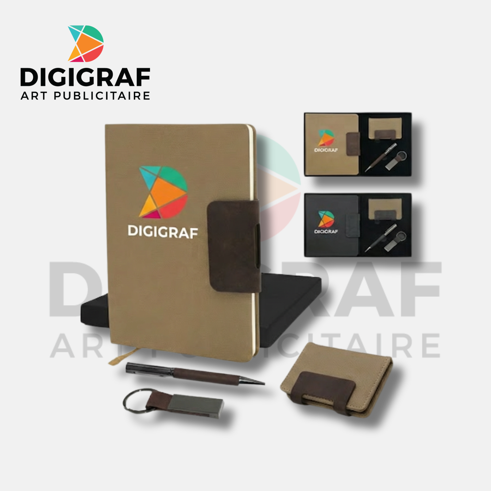 Chaque élément peut être personnalisé par impression UV couleur ou gravure laser dans nos ateliers à Nador. Disponible en deux teintes sobres et professionnelles : Brun Caramel et Noir Anthracite.