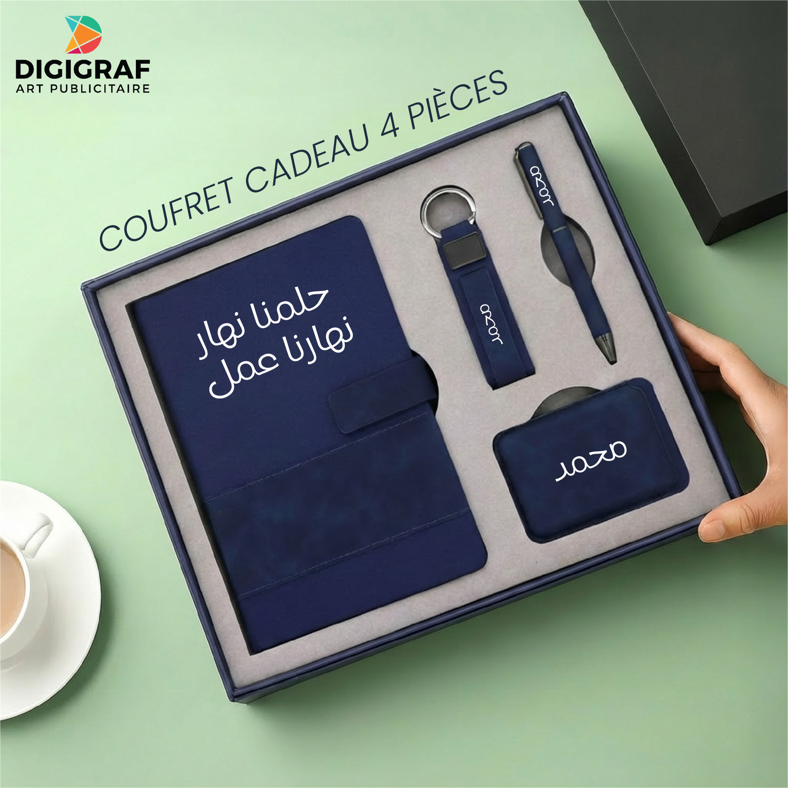 Chaque élément est personnalisé sur mesure (en arabe, français ou avec votre logo) avec une précision chirurgicale, garantissant un rendu qui valorise instantanément votre entreprise. Présenté dans un coffret de luxe avec intérieur en velours thermoformé, c’est le cadeau mémorable par excellence pour vos clients VIP au Maroc.