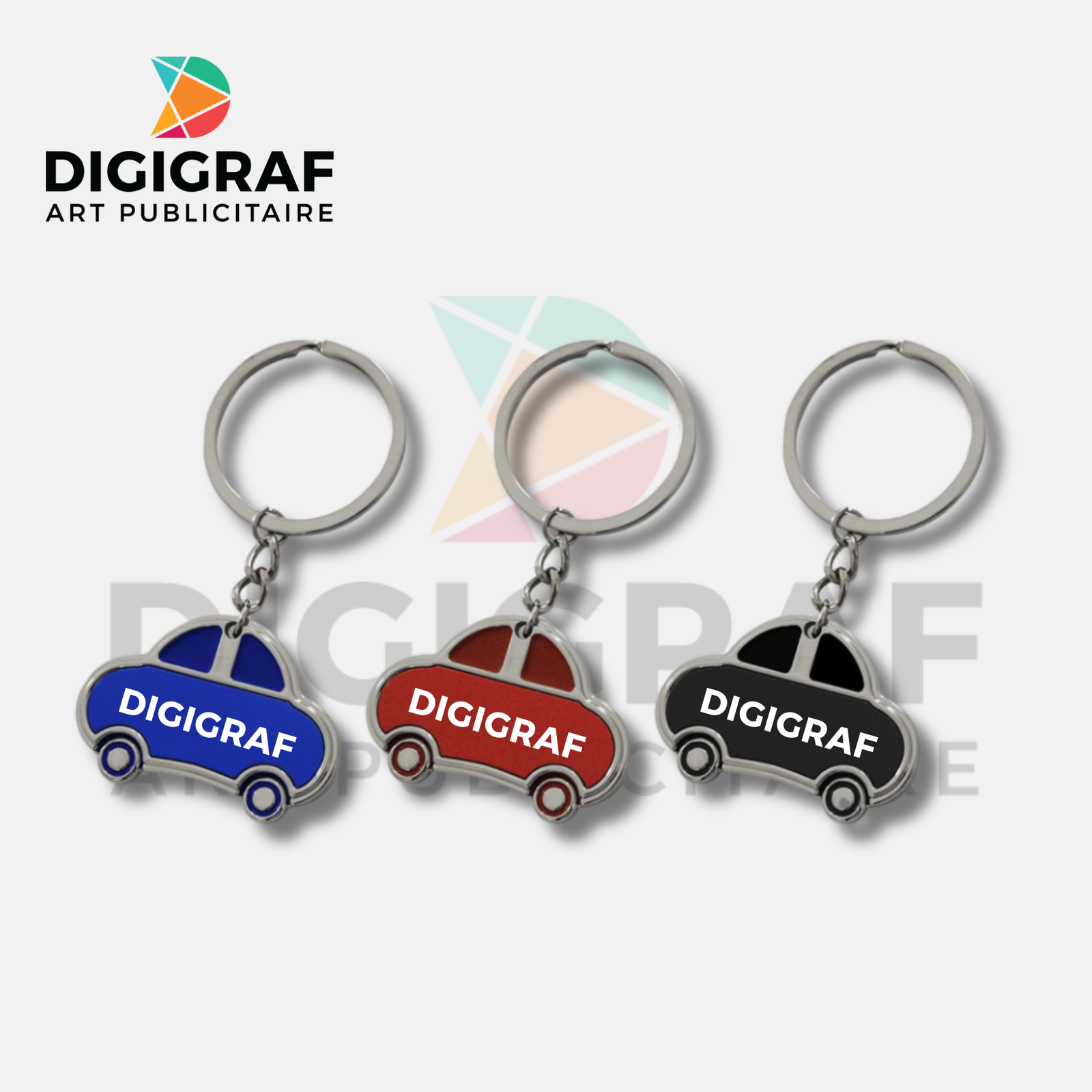 L’accessoire de prestige pour accompagner chaque véhicule. Ce porte-clés en métal de haute qualité adopte une silhouette de voiture iconique, offrant un support de communication moderne et robuste. Sa finition chromée élégante est associée à un insert coloré (Bleu, Rouge ou Noir) qui mettra parfaitement en valeur votre identité visuelle.