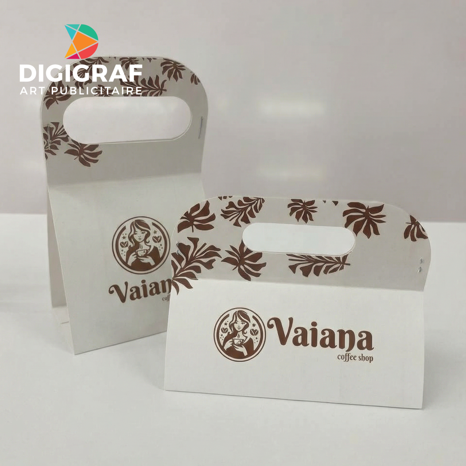 Transformez chaque commande à emporter en un support publicitaire itinérant. Ce porte-gobelet en carton robuste est la solution idéale pour offrir à vos clients un transport pratique et sécurisé de leurs boissons chaudes ou froides. Grâce à sa conception ergonomique avec poignée intégrée, il permet de transporter deux gobelets simultanément sans risque de brûlure ou de renversement.