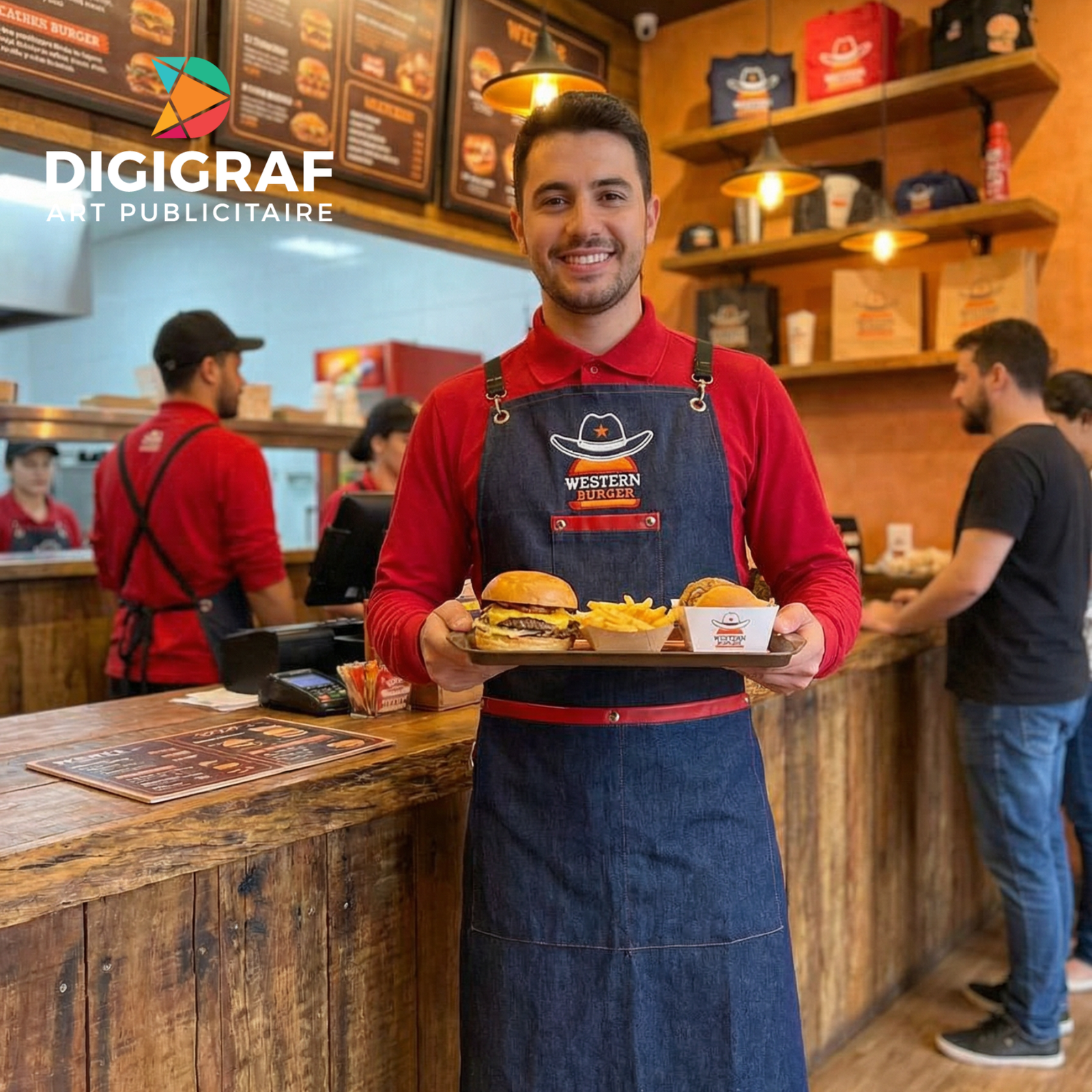 Le point fort de ce produit est sa broderie personnalisée multicouleur réalisée avec une précision exceptionnelle. Que ce soit pour une enseigne comme « WESTERN BURGER » ou votre propre concept, le logo est brodé directement sur le haut du tablier avec des fils haute densité qui résistent aux frottements et aux lavages intensifs.
